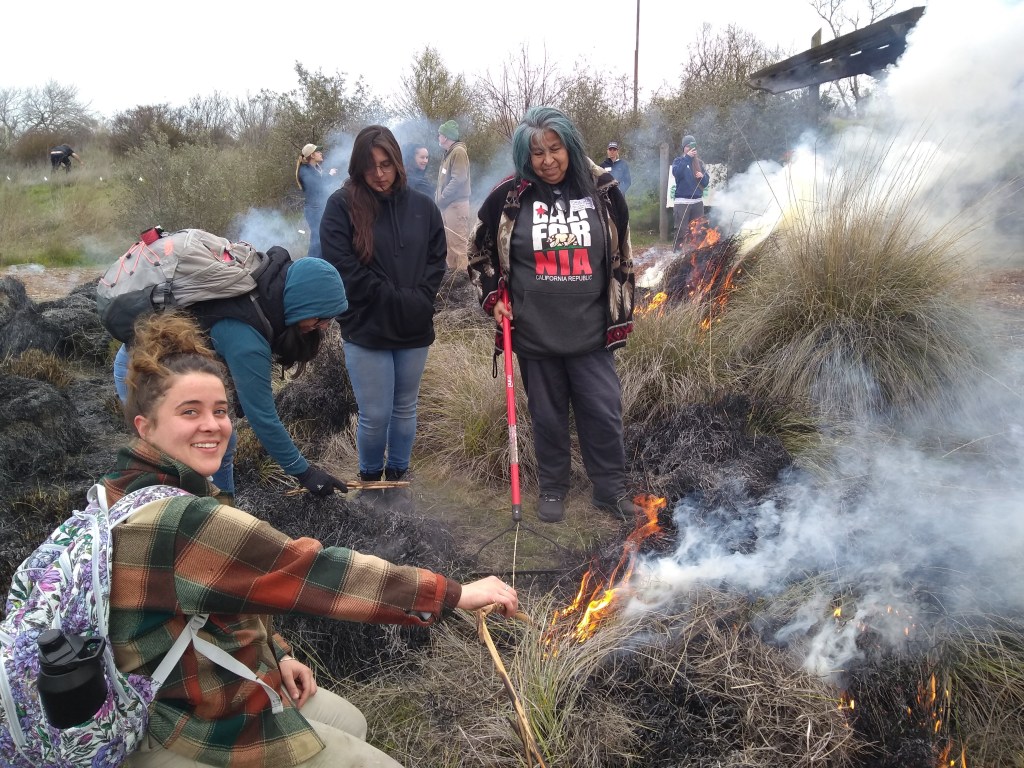 Students help burn deergrass with elder Diana Almendariz at Indigenous Fire Workshop